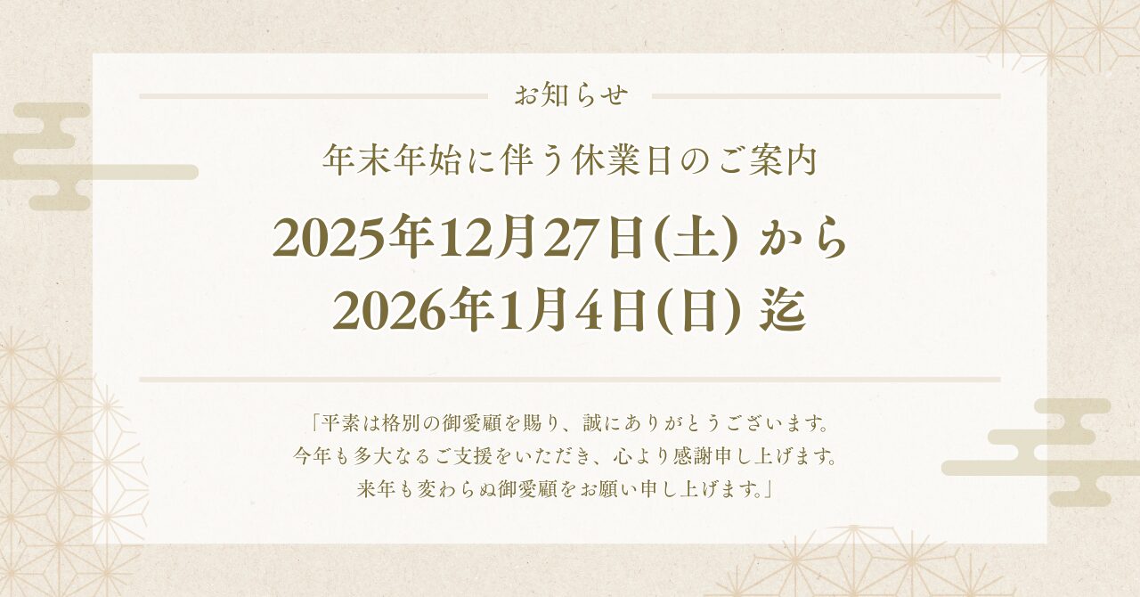 年末年始休業日:2025年12月27日(土)~2026年1月4日(日)