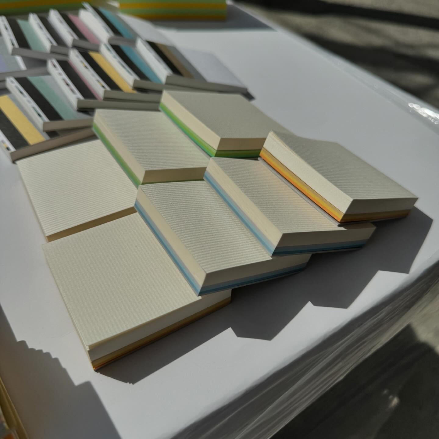 メモ帳などの天糊(てんのり)製本や、ブロックメモの製本。糊やボンドで束ねた紙の上部を巻いて止めるクロステープです。色や幅も豊富です。製本の背の部分に布テープなどを巻きつける加工です。補強や装飾の目的があります。
