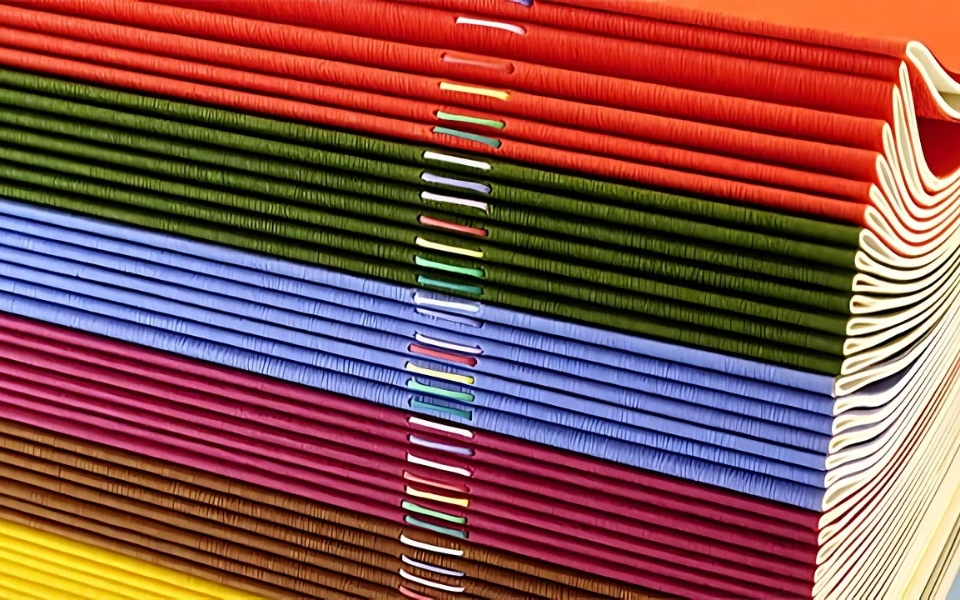 雑誌や文庫本、報告書など、幅広い書籍で採用されるのが無線綴じ製本(くるみ表紙)です。本文の背を糊で固め、表紙をくるむように仕上げるため、耐久性が高く、読みやすさも兼ね備えています。特に、背の部分にはホットメルト接着剤という特殊な糊が使われることが多く、これによりしっかりとページを固定し、長期間の使用にも耐えられます。厚紙を布や合皮などでくるむことで、高級感あふれる仕上がりになるのも特徴です。